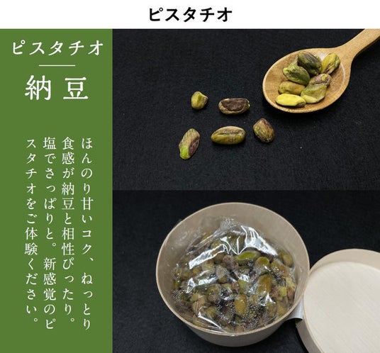 ピスタチオほんのり甘いコク、ねっとり食感が納豆と相性ぴったり。塩でさっぱりと。新食感のピスタチオをご体験ください。