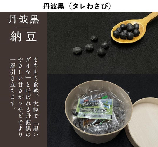 丹波黒(タレわさび)もちもち食感、大粒で「黒いダイヤ」と呼ばれる丹波黒のやさしい甘さがワサビでより一層引き立ちます。