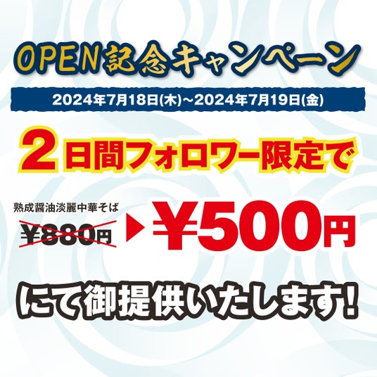 1.Instagram公式アカウントをフォローした方限定で、2024年7月18日(木)~2024年7月19日(金)の2日間で「熟成醤油 淡麗中華そば(¥880)」をワンコイン500円でプレゼント!