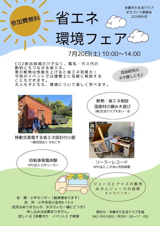 生活クラブ生活協同組合・東京(本部:東京都世田谷区 以下、生活クラブ東京)は、7月20日(土)、8月3日(土)の2日間、再生可能エネルギーや省エネルギーについて楽しく学び・体験できるイベント「省エネ環境フェア」「再エネ省エネフェア」を東京都内2カ所(7/20小平市、8/3豊島区東池袋)で開催します。
