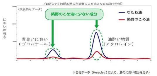 こめ油は油酔い物質と青臭いにおいの発生量が一般的な植物油と比較して少ないのが特徴です。揚げ物をすると周りに油のニオイが立ちこめて、気分が悪くなったり食欲がなくなったりする「油酔い」と言われる状態になることがあります。こめ油はこれらの発生量が少ないので、快適に調理ができ、イヤなニオイが充満しにくいです。髪や服にもニオイがつきにくいので調理をしている方も快適です。