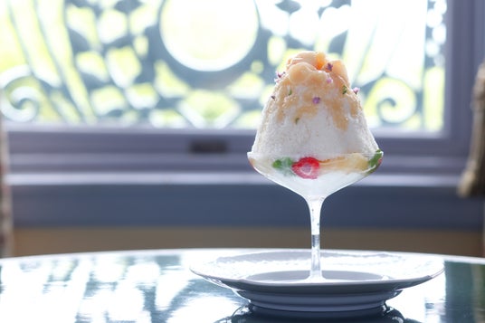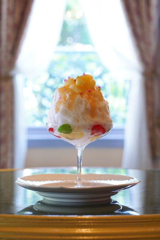 長楽館氷菓は、日本の夏の風物詩「かき氷」と、ブリオッシュに洋酒入りシロップを染み込ませたフランス伝統菓子「サバラン」を組み合わせることで生まれた、味わいの変化を楽しんでいただくスイーツです。かき氷をデザートとして追求し、「最後の一口まで楽しめる」オリジナルスイーツを創りました。