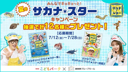 『ギョギョッとサカナ★スター選手権』の配信を記念し、「NHKこどもパーク」公式Instagramと「NHKグループモール」公式Xでプレゼントキャンペーンを実施します。ご応募条件は「NHKこどもパーク」公式Instagramのフォロー&コメント、もしくは「NHKグループモール」公式Xのフォロー&リポスト。ご参加いただいた方の中から、合計で12名様に抽選で「ギョギョッとサカナ★スター展」のペアチケット、もしくは『さかなクンのギョギョッとサカナ★スター図鑑3』をプレゼント!!