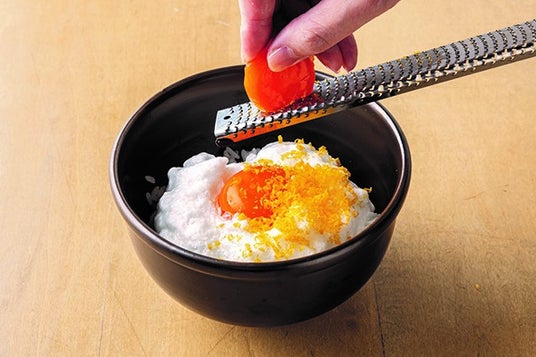 「タマスミ」は、野乃鳥の代表・野網氏が考案したオリジナルのカラスミ。卵黄を2週間塩漬けにし、その後、3週間に渡り天日干しにした、手間暇かけた逸品です。野乃鳥のTKGは、このタマスミを削って仕上げる、正にTKGの最高峰なのです。卵のカラスミ仕立て「タマスミ」をたっぷりかけて、さらにワンランク上の贅沢を堪能できます。