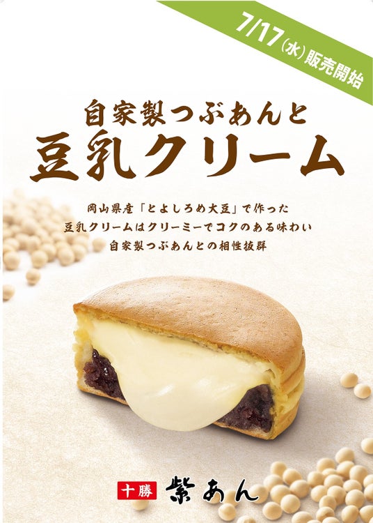 『紫あん』は、こだわりの自家製つぶあんを使用した軽食・甘味が楽しめる「あん専門店」です。この度、新商品として店内で炊き上げる自家製つぶあんと岡山県産の“とよしろめ大豆”を丸ごと使用した豆乳クリームを組み合わせた大判焼を販売いたします。”とよしろめ大豆”は、クリーミーでコクのある味わいが特徴で甘さひかえめの紫あん自家製つぶあんと相性抜群です。おやつや小腹満たしだけでなく親しい方への手土産にも最適な一品となっております。