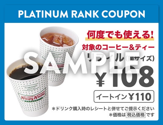 なお、クリスピー・クリーム公式アプリ『Krispy Kreme for APP』のプラチナ会員様は、価格改定後もリフィルサービスを引き続き100円(本体価格)でご利用いただけます。毎月1日に付与されるランク別クーポンのメニューに追加を予定しております。