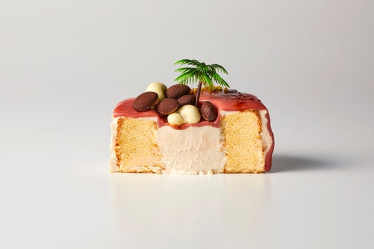 シフォンケーキをベースにしたケーキで、ケーキを火山に見立て、マグマが流れ出る様子を再現。