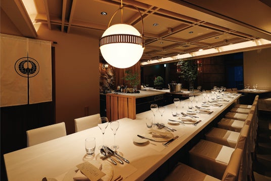 フランス料理の美しい盛り付けと日本の伝統的な食器や器具を使用し、日本ならではの美を演出します。臨場感あふれるサービスで割烹とレストランが交錯する独自の世界観をお楽しみいただけます。