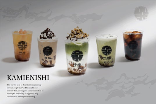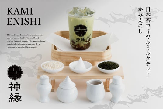 日本茶ロイヤルミルクティー 神縁 (かみえにし):静岡県掛川産の「1番茶のみ」を使用した"深蒸し緑茶"など最高品質の日本茶葉を厳選し、酪農家と茶農家の協力で独自のロイヤルミルクティー製法を開発。本わらび粉入りわらび餅を加えたわらびもちドリンク。