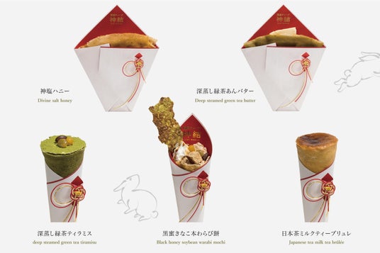 ご神米クレープ 神結 (かみむすび):パリパリ/もちもち生地、また米粉/緑茶味 の4種類からなる日本を感じさせる見た目と味の、細部まで日本を感じさせるこだわり抜いた和クレープ。その4種の生地は、研究を重ねたレシピにより1つの生地から作ることができる。