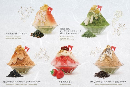 天然清水かき氷 お神氷 (おみひょう):神聖な水を使用し、日本茶ロイヤルミルクティーを取り入れたかき氷。玄米茶と白桃の清水かき氷、ほうじ茶ロイヤルミルクティーと黒ごまバナナのカキ氷など多彩なメニューを展開。神縁と同じ材料で作ることができる。
