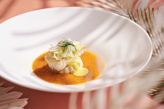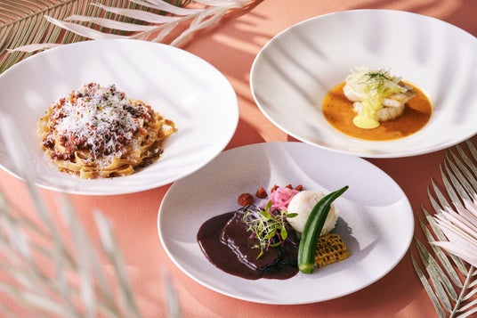 ロイヤルハワイアンのメインダイニング「Azure」と、レストラン&バー「Mai Tai Bar」の名物メニューをアレンジ。牛ほほ肉にフライドポーチドエッグと枝豆ライスを組み合わせたロコモコや、ハワイで定番の魚“マヒマヒ”のソテーにトマトと魚介のチョッピーノソースとサフランルイユを合わせたメニュー、ラグーソースのパスタをランチコースのメインディッシュでお選びいただけます。