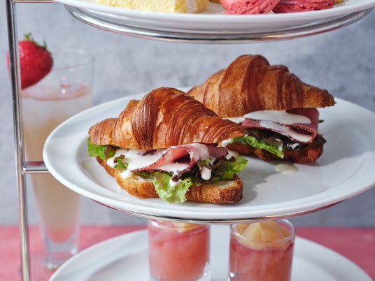 RITUEL CAFE ルミネ新宿店のティースタンドは、三段構成でご用意しています。紅茶、カフェラテボウル、コーヒーなどの豊富なドリンクメニューが時間内でおかわり自由となっております。ティースタンド上段のお皿には、生の桃がたっぷり盛り付けられた“桃と水切りヨーグルトのパルフェ”、濃厚なマスカルポーネクリームをたっぷり挟んだ“桃とマスカルポーネのフルーツサンド”、生の桃に濃厚なサワークリームが相性抜群の“桃のサワークリームタルト”、“ベリーマカロン”をご用意。中段のお皿には、 RITUEL自慢のクロワッサンに、パストラミビーフとレタスを挟みシーザードレッシングで味付けをした“パストラミビーフのクロワッサンサンド”。下段のお皿には、スペイン産の生ハムであるハモンセラーノと桃を盛り付けした“生ハムと桃のタルティーヌ”、ピーチホワイトチョコを纏った“ピーチフィナンシェ”、爽やかな“ピーチゼリー”をご用意しました。また、別皿で季節限定のケーキや、定番のモンブランタルト、フロマージュキュイなど、約10種類の中から、お好きなカットケーキをお一つお選びいただけます。また、同内容に、ウェルカムドリンクが付いたコースもご用意しています。こちらのコースは、ロゼスパークリングorノンアルコールブルーティーソーダより、お好きな乾杯ドリンクをお選びいただけます。