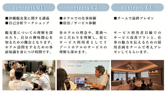 5つのホテルから提供される「仕事体験・サービス体験」をもとに、学生自身の気づきや学びを発表していただく本プログラム。初めに沖縄の観光業やブランディングを学ぶ座学、自己分析ワークを行います。業界と学生自身への理解を深めることで、体験で得られる気づきの質を高めます。「仕事体験」からは、ホテルがそれぞれ大事にしている考え方を知り、最終プレゼンで、学生自身がそのホテルの選考を受けたみたいと思える採用施策の企画をしていただきます。また、「サービス体験」では、顧客目線から気づき得たサービスの改善策を提案していただきます。優れたアイディアは、実現に向けてサポートいたします。