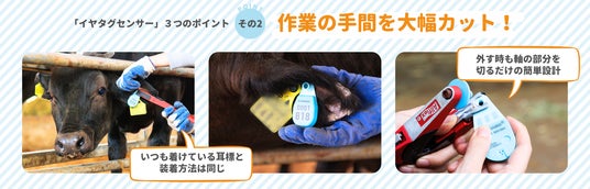 すべての牛に装着が義務付けられている耳標と同じ手順で、簡単に装着していただけます。センサーを外すときは、はさみで軸の部分を切っていただくだけで、すぐに取り外すことができます。