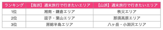 海派と答えた人が週末旅行に行きたいエリアは「湘南・鎌倉エリア」「逗子・葉山エリア」の神奈川県のリゾートエリアが過半数を占める結果となりました。山派が週末旅行に行きたいエリアは「秩父エリア」「那須高原エリア」「八ヶ岳・小淵沢エリア」がそれぞれ60.3%、57.5%、56.8%と首都圏から程近い雄大な自然を楽しめるエリアに人気が集まりました。また、箱根エリアは、海派54.3%、山派45.7%と、どちらからの人気も高く総合順位では1位となる結果となりました。