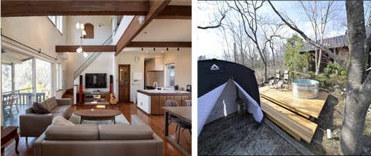 2、3組のご家族でも泊まることができる全室富士山ビューのヴィラでは、吹き抜けで開放感のあるリビングが特徴的。4台のスピーカーが設置されており、まるで映画館やコンサート会場のような迫力を楽しむことができます。さらに、リビングと和室やサンルームといったそれぞれのお部屋は引き戸を隔てて繋がっており、思い思いの楽しみ方ができます。お庭にはテントサウナを完備し、八ヶ岳から湧く上質な井戸水を利用した水風呂と川沿いに設置されたデッキで整えば、心身ともにリフレッシュできます。