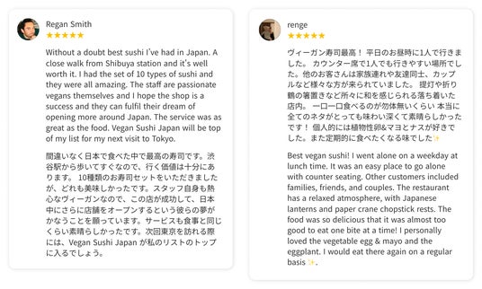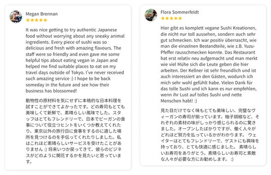 また、Google Mapsのレビューは100件以上・総合評価星5.0となり、ヴィーガン寿司の体験を高く評価いただいています。