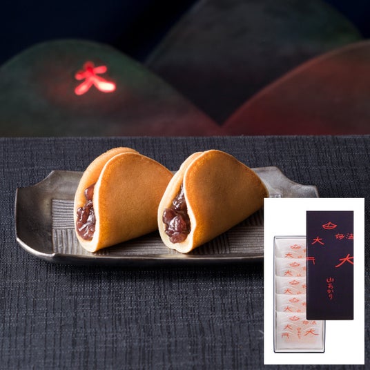 五山の送り火を表す包みに入った、山をかたどるもっちりとした焼皮に粒あん入りの焼き菓子です。