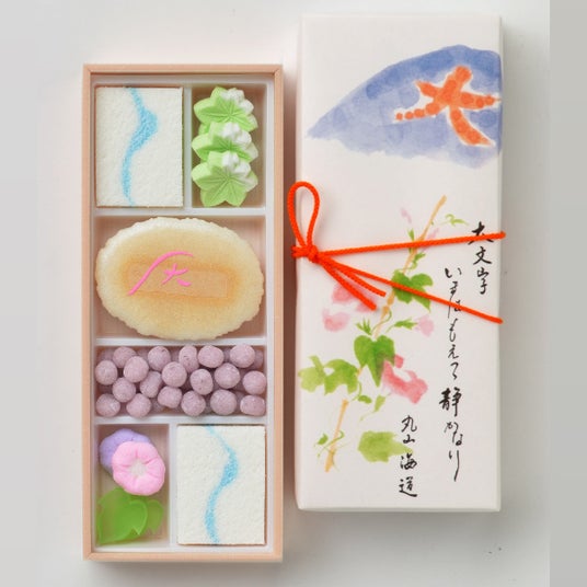 大文字の意匠の麩焼き煎餅や朝顔の打物など、季節を映した干菓子を詰め合わせました。