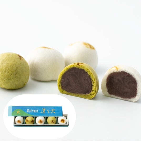 古都の夜空に浮かび上がる五山の送り火をイメージ。もっちりとした生地に粒あんと抹茶あんの2種類ご用意。
