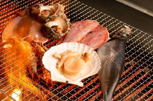 ■炉端焼き肉・魚・野菜など焼き台周りに並べられた食材を炭火焼きにし、カウンターのお客さまへは大しゃもじでご提供いたします。
