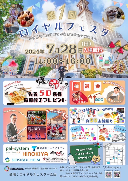 MEWKS(群馬県邑楽郡千代田町、代表:中島)とロイヤルチェスター太田は、2024年7月28日(日)に「ロイヤルチェスター太田」にて、第1回ロイヤルフェスタを開催いたします。本イベントは、皆様に日常を忘れ、特別なひとときを楽しんでいただけるよう、さまざまなプログラムをご用意しております。