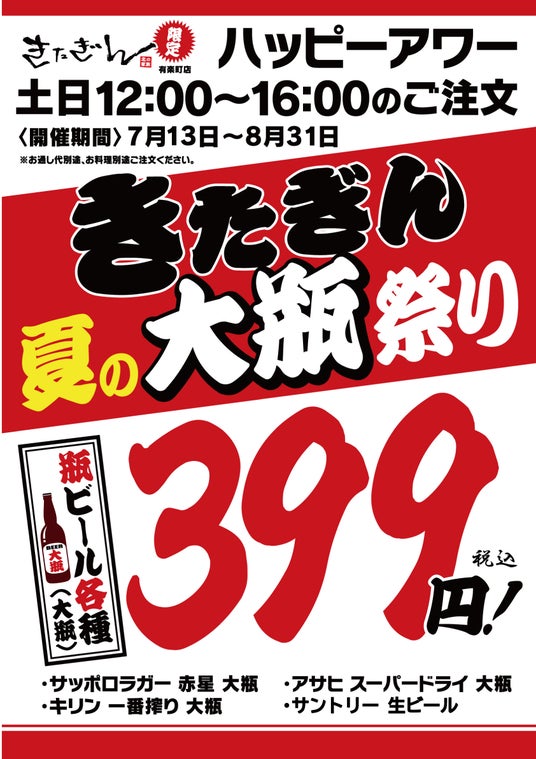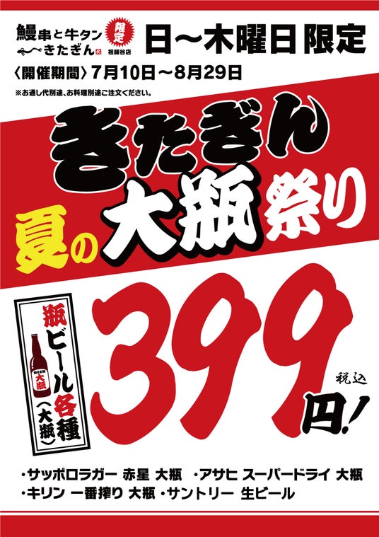 夏と言えばビール!「鰻と牛タン ろ端焼き きたぎん祖師ヶ谷大蔵」と「道産酒場 きたぎん!」では梅雨が明ける前、本格的な夏到来よりも一足先に『夏の大瓶祭り』を開催いたします。