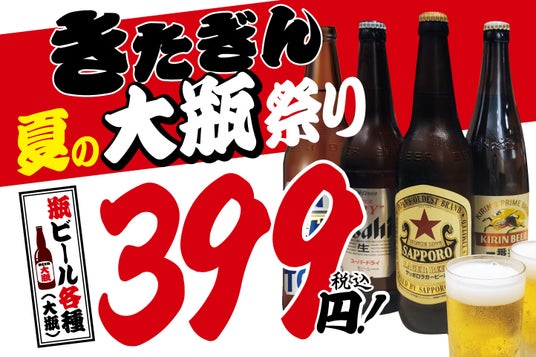 瓶ビール(大瓶)各種、大特価399円(税込)でご提供いたします。