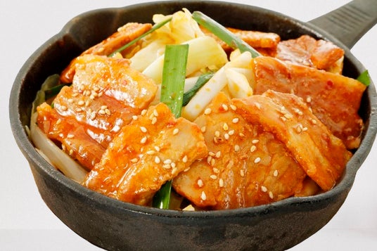 デジカルビ(ハングル=????)のデジ(??)は豚。 カルビ(??)はバラ肉の意味になります。 自家製タレに絡め炒めました。