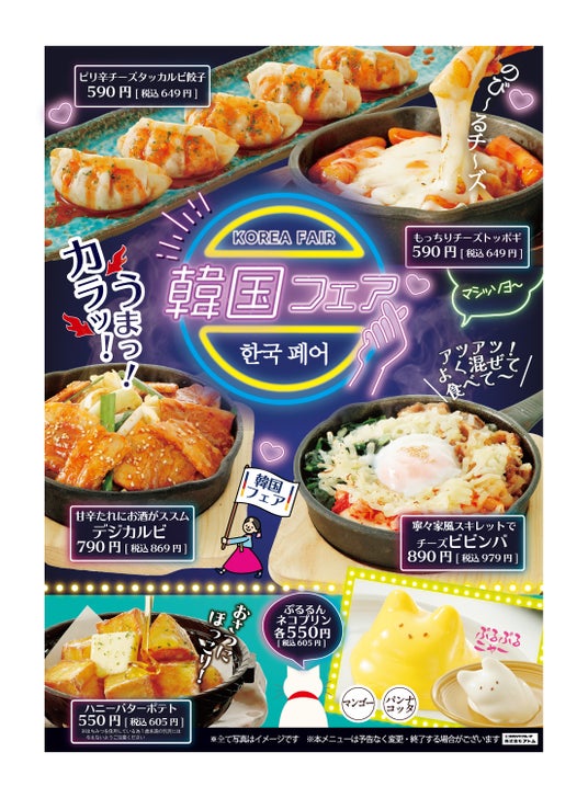 現在、韓国から発信されるトレンドは、若者を中心に魅了し続けています。食に関しても、様々な販社より韓国グルメフェアの実施や、韓国風おしゃれカフェの相次ぐ出店など、年々増え続けるニーズに応える動きが見られます。当社におきましても身近な「寧々家・暖や」という店舗で韓国グルメを体験してほしいという思いから人気商品を寧々家・暖や風にアレンジした居酒屋で楽しむ「韓国フェア」を実施致します。