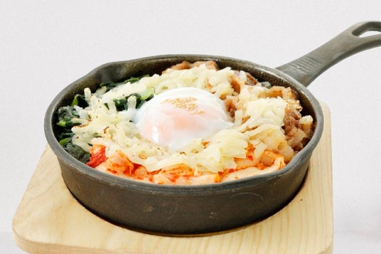 寧々家はオシャレにスキレットでご提供。アツアツのビビンバ、良く混ぜてお召し上がりください。