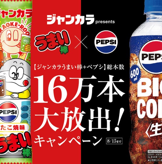 また、今回キャンペーンでゲットできるうまい棒は「ペプシ」と「ジャンカラ」のオリジナルコラボレーションデザインとなり総本数なんと16 万本大放出となります!