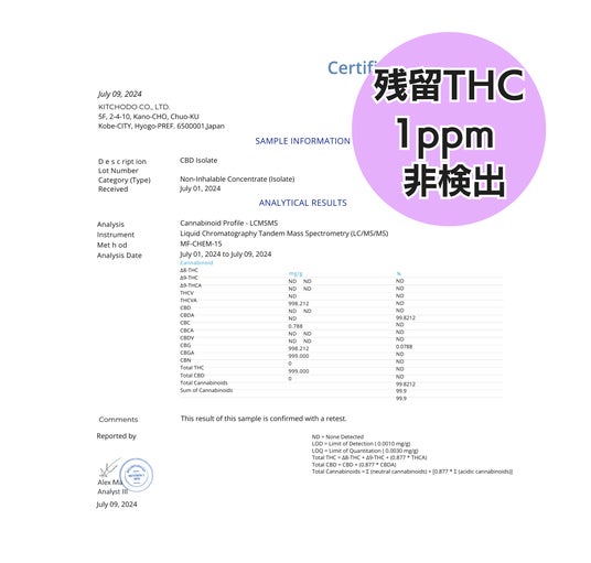 また、原料の成分分析なども改めて実施し、CBDの残留THC濃度1ppmの厳しい基準においてもクリアしております。