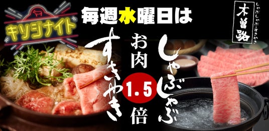 開催期間中の毎週水曜日に全国の「しゃぶしゃぶ・日本料理木曽路」にご来店いただくと、対象商品のお肉が1.5倍で楽しんでいただけます。