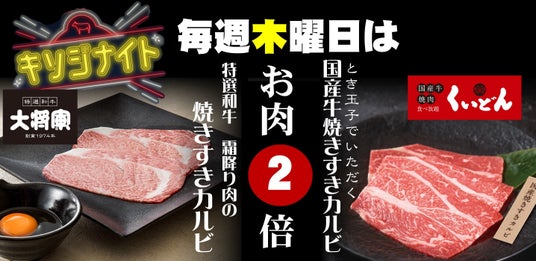 さらに、毎週木曜日に「大将軍」と「くいどん」にご来店いただくと、対象商品のお肉が、