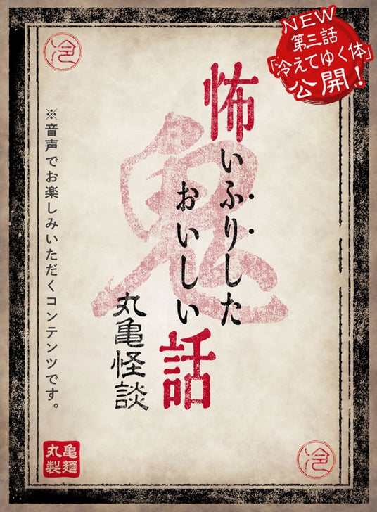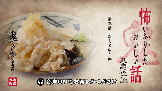 暑さが続く夏。日本の夏の風物詩である怪談のように、丸亀製麺の「鬼おろしシリーズ」でひやりとする心地よい涼しさを感じてほしいという想いを込めた、今年の夏の特別企画「怖いふりしたおいしい話 丸亀怪談」を期間限定で公開しています。 「怖いふりしたおいしい話 丸亀怪談」では、人気の怪談師がそれぞれ「鬼おろしシリーズ」のおいしさを熱演。怖いふりしてまったく怖くない、聴けば聴くほどひんやりとおいしそうな「丸亀怪談」を披露します。非常に多くのお客さまに楽しんでいただき「怪談のあるあるな言い回しが面白い」「オチが気になって気づいたら全部聞いてた!」などのお声をいただいています。