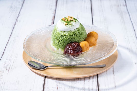・抹茶練乳抹茶アイスを包んだ純氷に、抹茶の苦みと練乳の甘さを合わせたクリーミーな抹茶ソースをかけて、黒蜜につけた白玉と小倉あずき、おかきをトッピングしました。