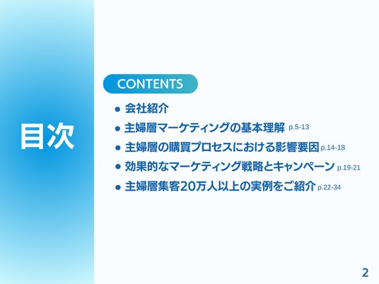 本レポートでは、主婦層の集客数UPをしたい方向けにマーケティングのアプローチを弊社の実例をもとにご紹介しています。