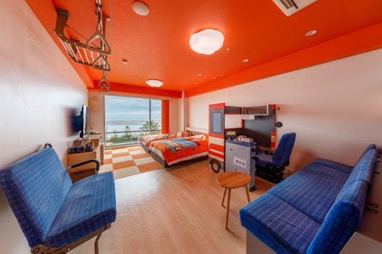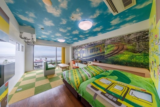 「小湊鉄道」「いすみ鉄道」「銚子電気鉄道」の3つの鉄道会社の特徴を集めたオリジナル鉄道ルームになります。 3社各社の車両フェイスが並んだ豪華な仕立てに加え、『電車でGO』ブースを設置し楽しく過ごしていただける設定です。2部屋を1部屋に拡大しており、ベッド3台と寝台列車風2段ベッドも設置して8名までご利用いただけます。