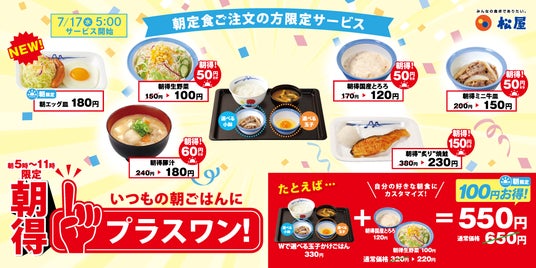 このたび松屋フーズ(本社:東京都武蔵野市、代表取締役社長:瓦葺一利)では、牛めし・カレー・定食・その他丼の「松屋」におきまして、2024年7月17日(水)5時より、朝定食をご注文の方限定でサイドメニューをお得にお買い求めいただける「朝得プラスワン」を開始いたします。