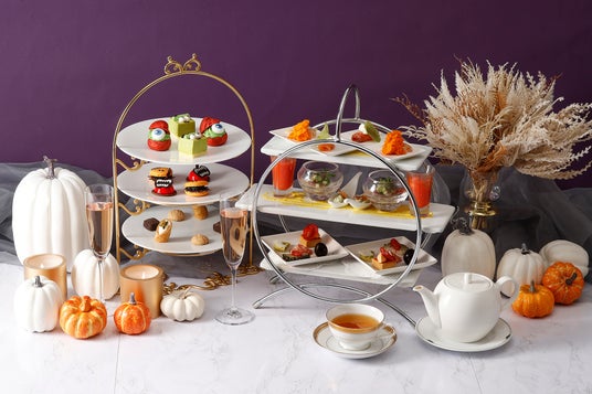 ハロウィンマジックにかかったモンスターたちが集う「モンスタータウン」をイメージしたアフタヌーンティーは、秋の味覚のかぼちゃ、紫芋、りんご、和栗を使用したハロウィンらしさを満喫いただけるプティ・ガトーを揃えました。