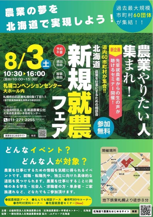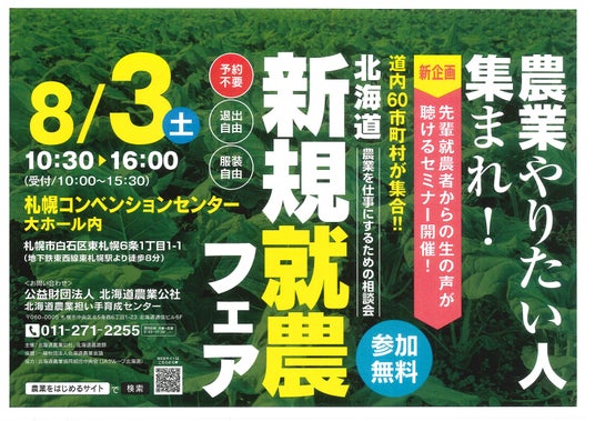 公益財団法人北海道農業公社と北海道は、就農を希望している方、農業体験を希望している方、都市部から離れ農村に興味・関心をお持ちの方、そして農業初心者が就農相談できるイベント「北海道新規就農フェア」を2024年8月3日(土)に、札幌コンベンションセンター1F大ホールにて開催いたします。