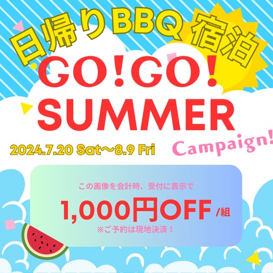 内容: 期間中に『宿泊』または『日帰りBBQ』をご利用いただいたお客様は、お会計から1,000円OFFとなります。上記、クーポン画像の提示が必要です(スクリーンショットでも可)。