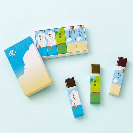 夏の日差しを爽やかに表現した、期間限定の化粧箱です。夏パッケージ小形羊羹『夜の梅』『おもかげ』『新緑』を詰め合わせました。
