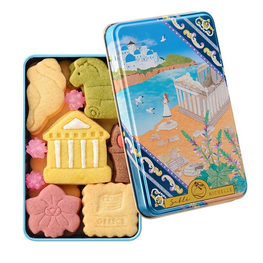 木馬や神殿、巻貝など愛らしいフォルムのサブレを、ギリシャの情景を描いた缶に詰め合わせました。