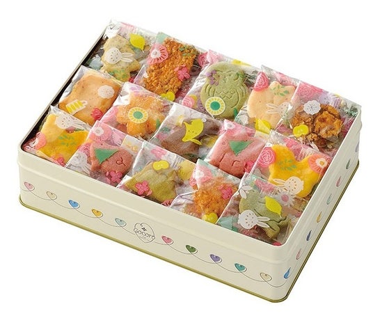 あげだし醤油や胡麻塩など10種類の揚げあられと、フクロウやウサギなど4種類のモチーフクッキーを1缶で楽しめるギフト缶です。