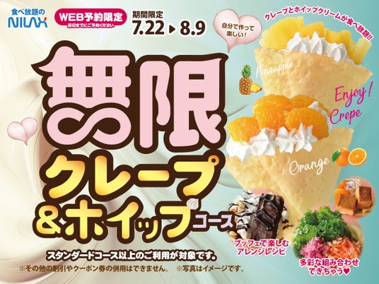ぜひこの機会に『無限クレープ&ホイップクリームコース』で、楽しい夏のひと時をお過ごしください。
