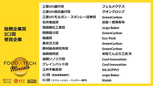 株式会社三菱UFJ銀行(本社:東京都千代田区、取締役頭取執行役員:半沢淳一、以下 三菱UFJ銀行)と、ESG領域においてベンチャー投資を行うインクルージョン・ジャパン株式会社(本社:東京都品川区、代表取締役:服部結花、以下 インクルージョン・ジャパン)は、ロンドン発のサステナブルなコミュニティ・フードマーケットで成功を収めているモビメント・メトロポリターノとともに開催したMUFG ICJ ESGアクセラレーター『FOOD×TECH Mercato(以下 フードテックメルカート)』にて、サステナブルな食・生物多様性の実現を目指す飲食事業者・ベンチャー企業の大賞を選出しました。