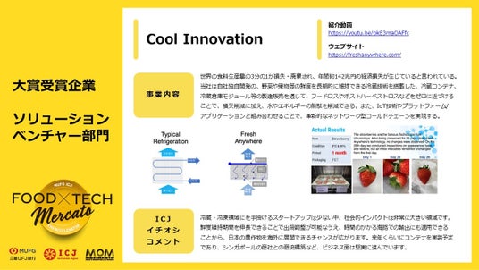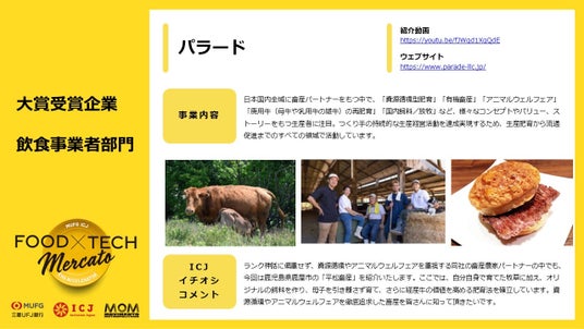 飲食事業者部門の大賞には、日本全国に資源循環やアニマルウェルフェアを重視する畜産農家パートナーをもつ「合同会社パラード」が選ばれました。ソリューション・ベンチャー部門では、野菜や果物等の鮮度を長期的に維持できる冷蔵技術を提供する「株式会社Cool Innovation」が受賞しました。さらに協賛企業賞、デモデイ参加者の投票により選出されるICJ賞も授与されました。